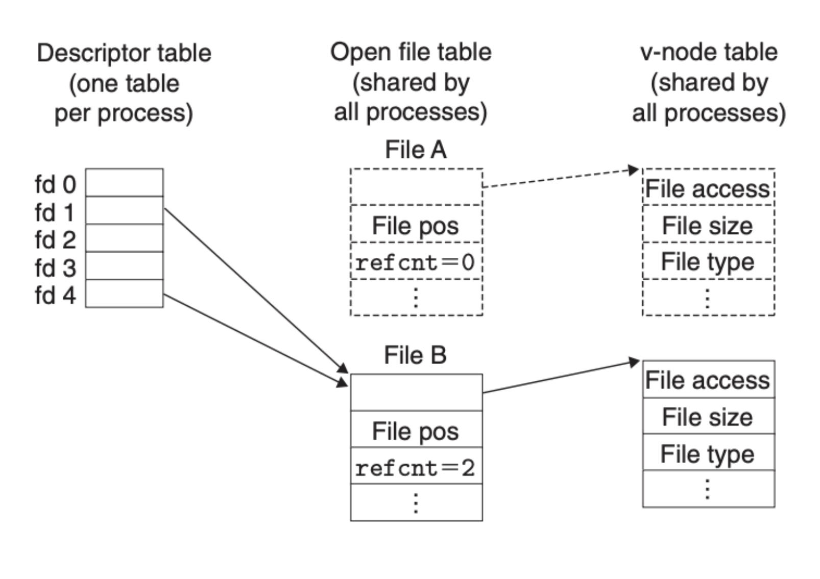 - 文件表(file table):这个表是所有进程共享的,里面包含所有打开的文件